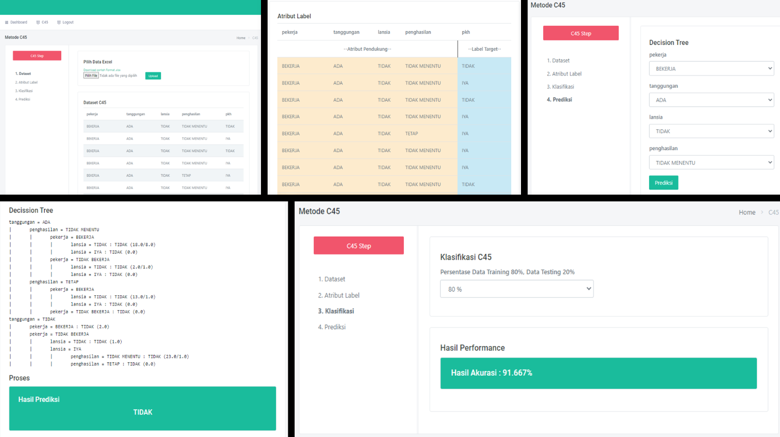 Aplikasi decission tree c45 berbasis web php, bisa untuk semua jenis dataset, terdapat pohon keputusan, dan dapat di customisasi sesuai kebutuhan