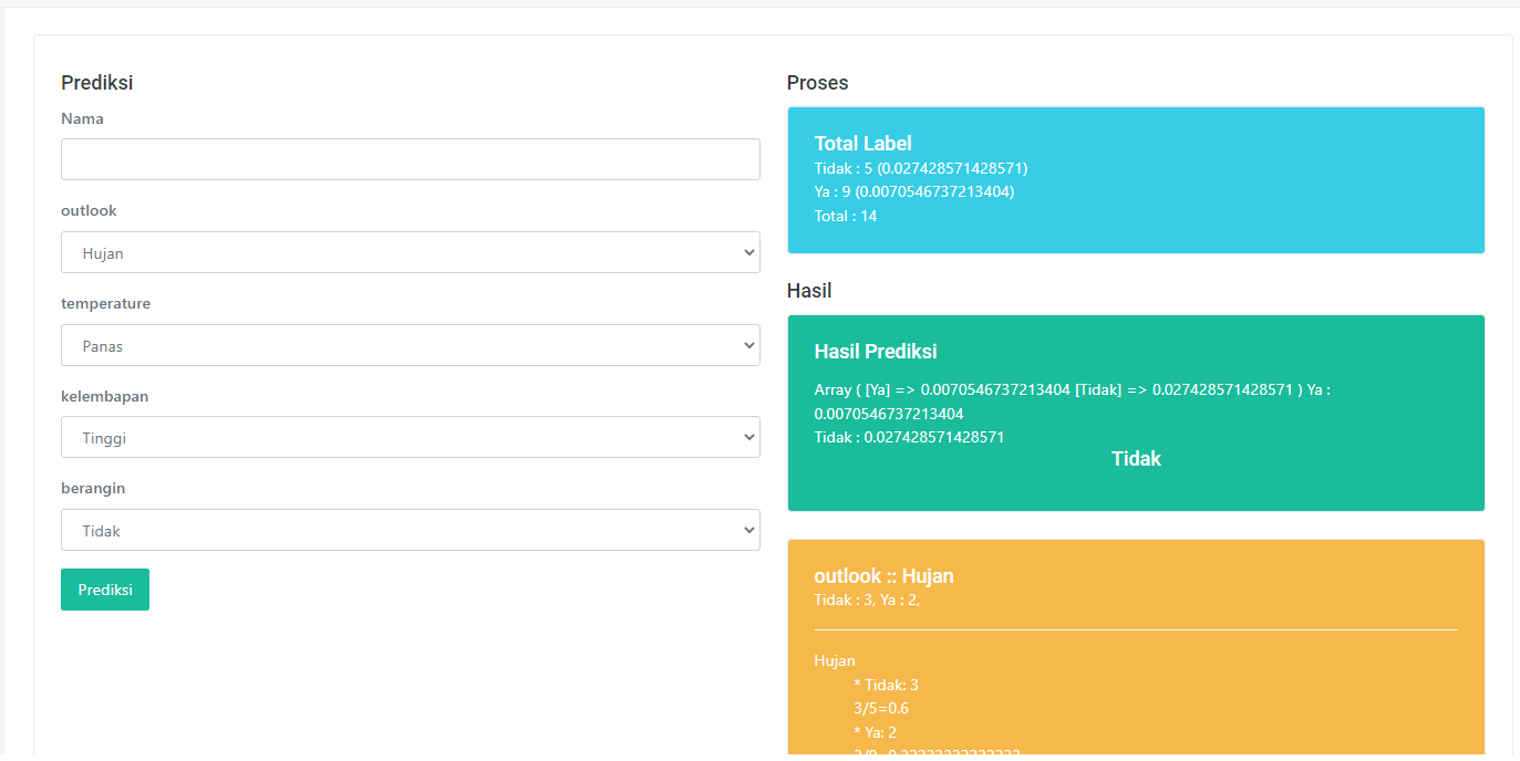 Aplikasi naive bayes web based php bisa untuk semua jenis dataset, dapat di customisasi, sudah teruji dengan benar perhitungan algoritmanya